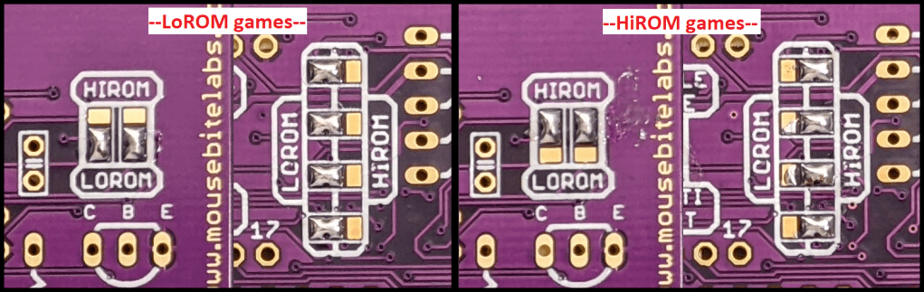 There are a few sets of three-way solder pads located in various locations on the board. You need to bridge two of the three depending on what bank type your game(s) is/are. Note that this bank selection will apply to both EPROM #1 and EPROM #2, if you’re using both (can’t make a multi-cart with one LoROM and one HiROM game).