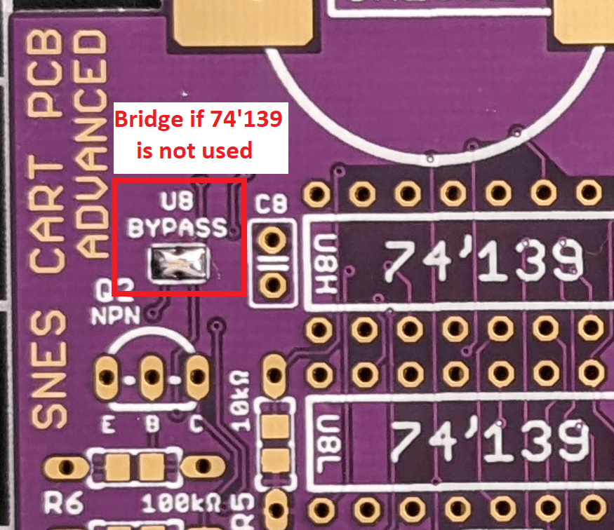 Function: Activates the ROM or RAM, depending on the memory address being accessed. U8L is populated for LoROM games, U8H is populated for HiROM games. You can put parts in both sockets if you want, the board will still work.