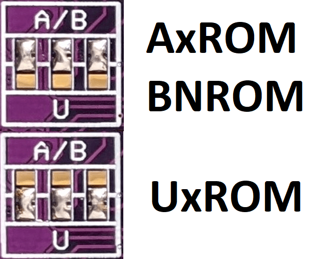 There’s a lone set of AxROM pads underneath the CHR type selection pads. Solder these together if making AxROM games.