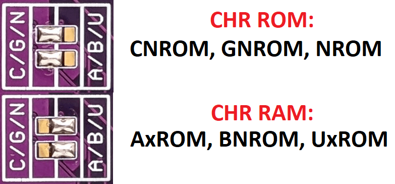 These sets of pads switch between board types that use CHR ROM or RAM.