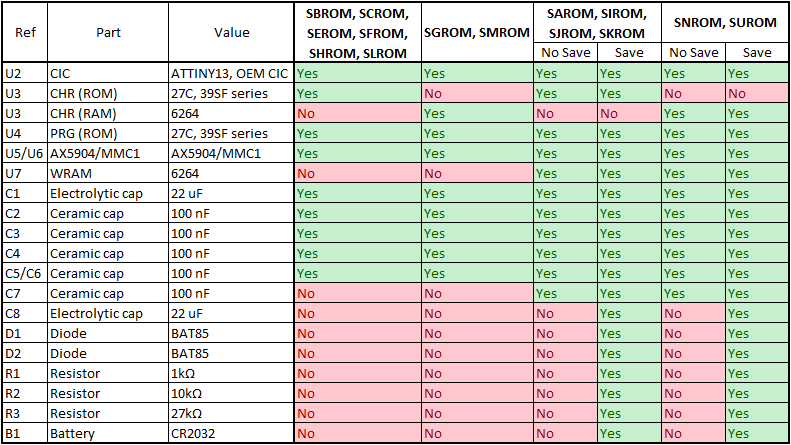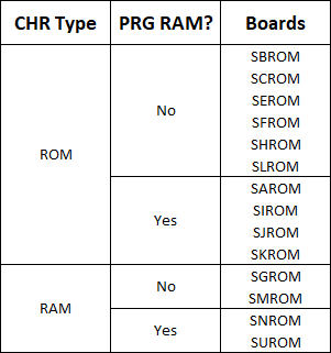 Here is a table of the various SxROM boards and their required hardware. Note that a few board types are not supported: SOROM, SXROM, and SZROM.
