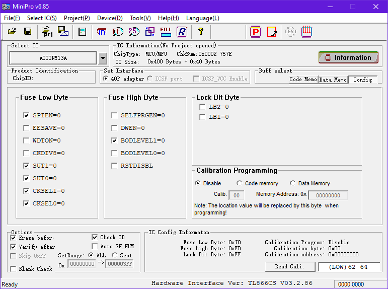 If you’re using the GQ-4×4, first write the software to the chip, and then set the config bits – so program the chip first. If you’re using the TL866, you can write the code and the config bits at the same time. To set the config bits, hit “CFG” for the GQ-4×4, or the “Config” tab on the right of the screen for the TL866. Then, set the bits like this: