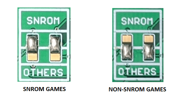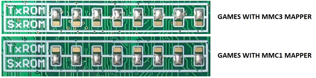 There are three sets of solder pads on the front, above the MMC1 socket. You must bridge these solder pads on every game in the proper setting. To choose a setting, simply add solder across the middle pad to the top, or the bottom, depending on which board type you are using.