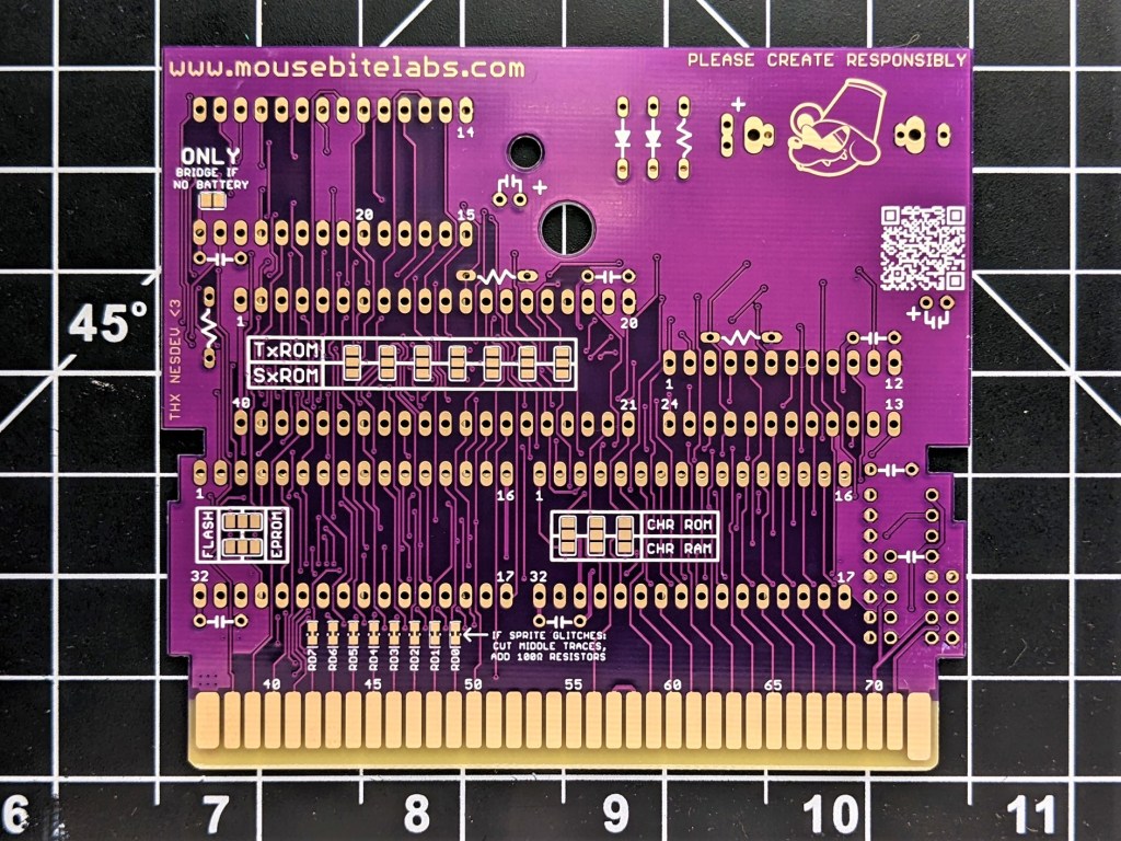 Solder the middle three pads to the top if you are making a game that uses CHR ROM, or to the bottom if you are making a game that uses CHR RAM.