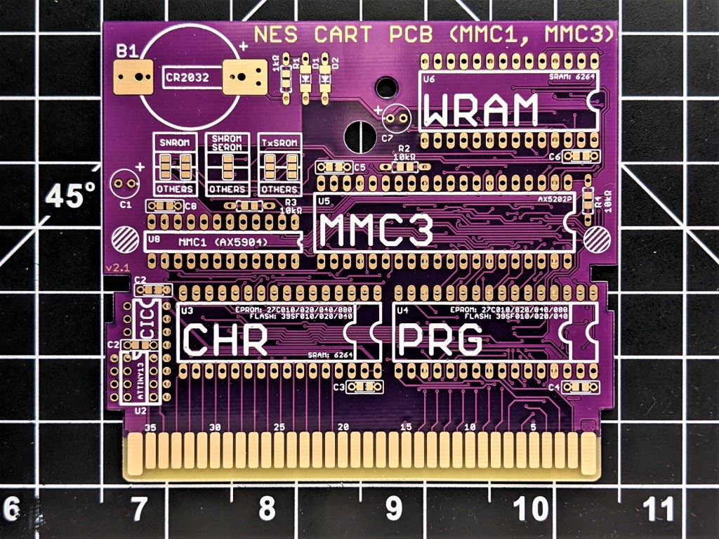 Here’s a guide on how to populate my custom designed NES reproduction PCB that can make MMC1 or MMC3 games. This board supports most MMC1 games with the SxROM board name, as well as most MMC3 games with the TxROM board name (where the lowercase ‘x’ is a stand-in for other board types). This means you can make games that use boards like SLROM, SNROM, TLROM, TGROM, etc. Check out the Nesdev wiki entry on SxROM games here and TxROM games here. The board utilizes the AX5904 to imitate the MMC1 mapper, or the AX5202 to imitate the MMC3 mapper.