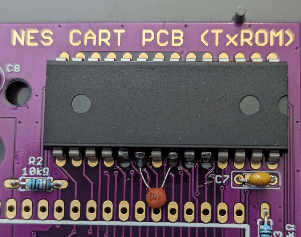 In some cases, if you’re using the board for an MMC3 game that uses SRAM (TKROM, TKSROM, TSROM, TNROM), you may notice some glitchy behavior. For example, sometimes on Super Mario Bros. 3, you might get a mystery block that spawns in the middle of the map. Or some games that use the PRG RAM for saving, you might find the game freezes when trying to access save files. If this is the case, you can add a 1 nF capacitor across the RAM pins 20 and 22.